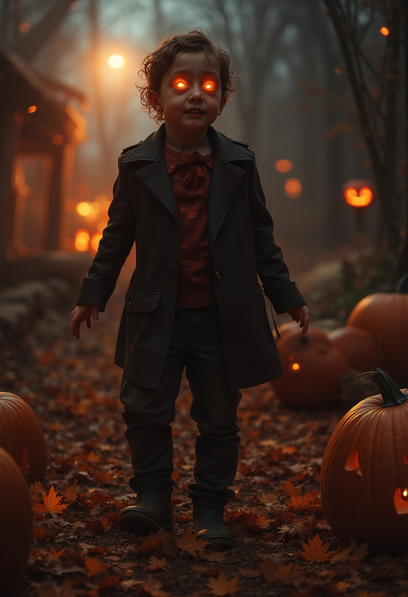 A child in a dark coat stands on a leaf-covered path surrounded by pumpkins. Glowing eyes create a spooky atmosphere on a misty autumn evening.