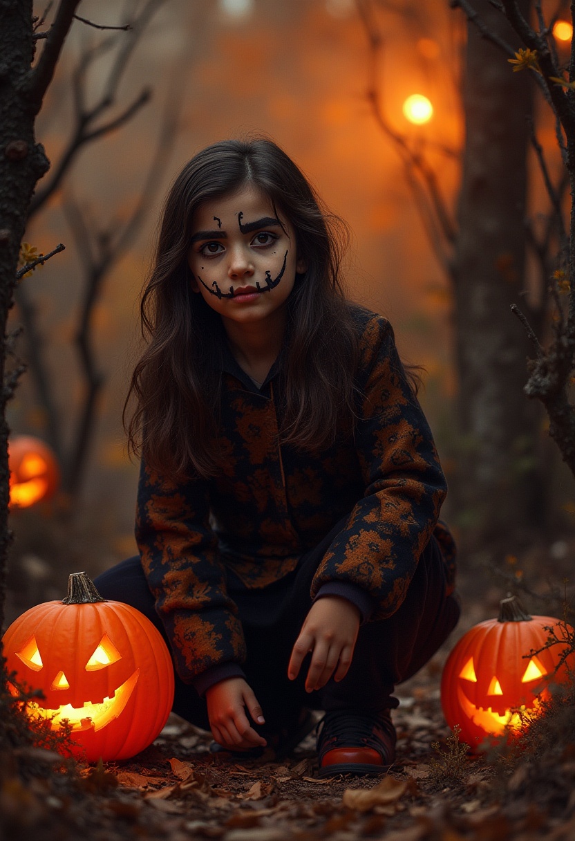 A girl with spooky face paint kneels among glowing pumpkins in a dark forest. The warm orange light adds to the Halloween atmosphere.