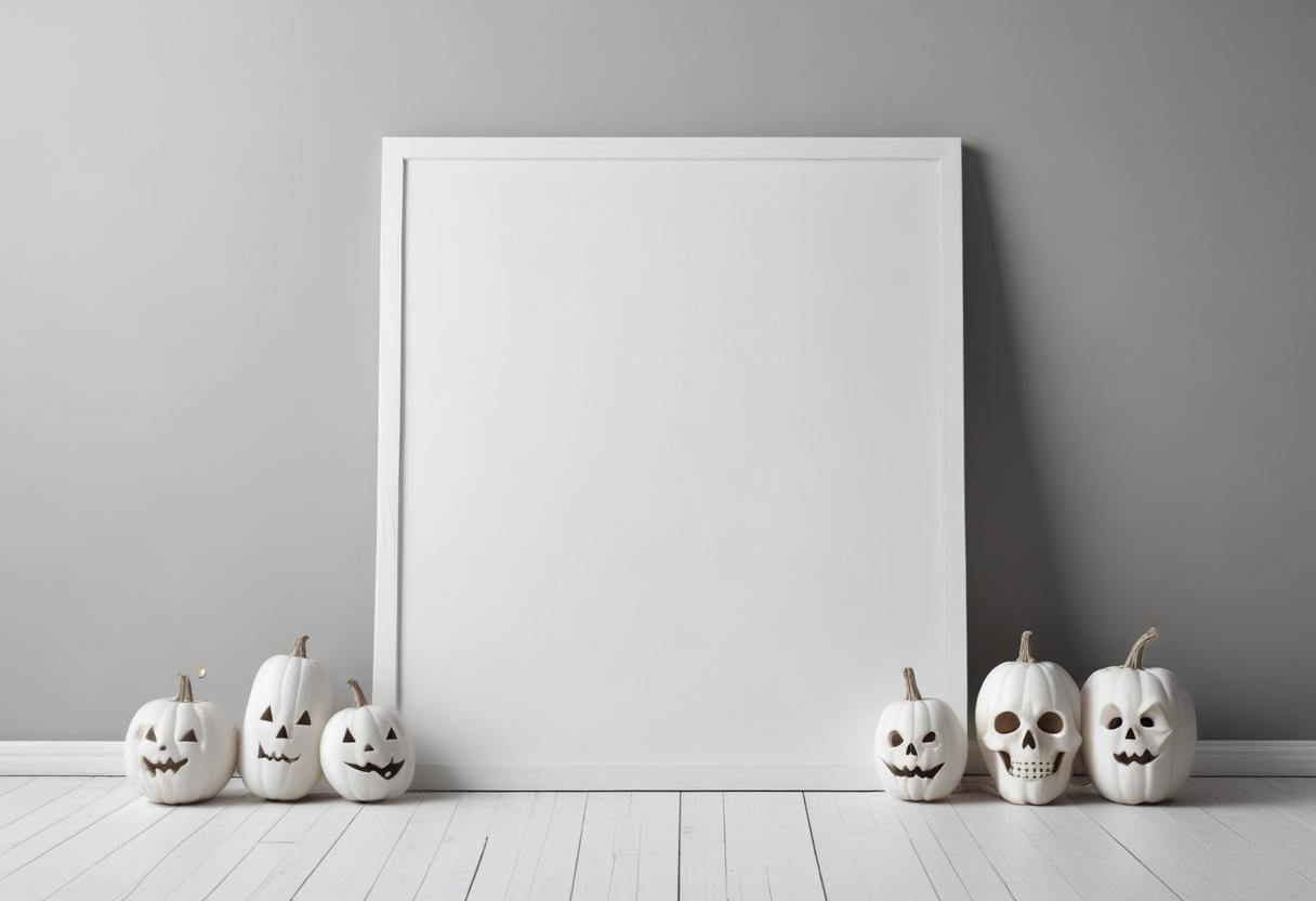 White pumpkins with face carvings and skulls are placed near a blank white frame against a gray wall, creating a festive atmosphere.