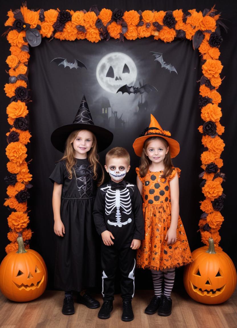 Halloween, autumn, bats, black, celebration, children, costumes, creativity, decorations, dress-up, festive, fun, ghosts, joy, orange, party, pumpkins, skeleton, spooky, witch