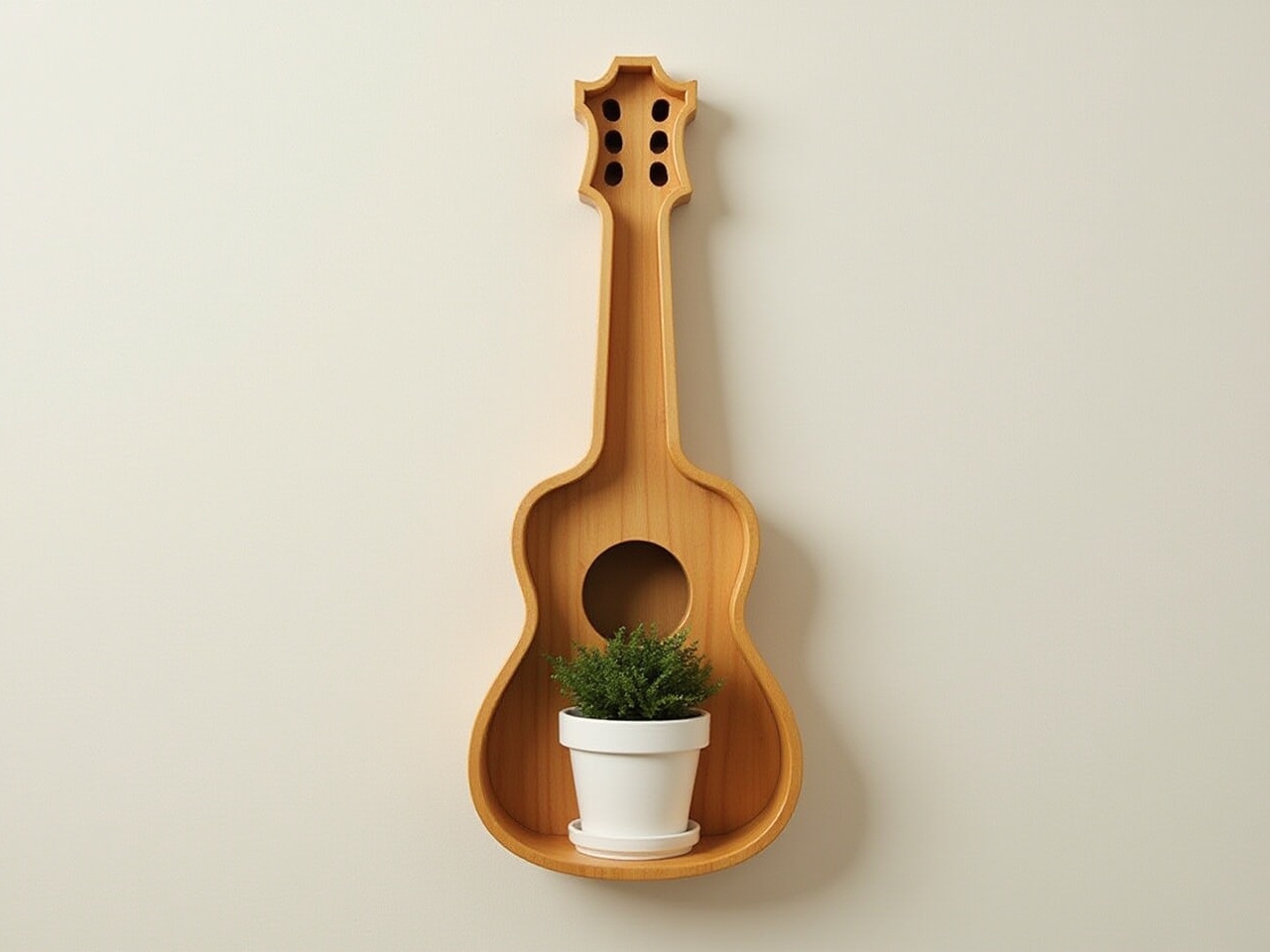 accessories, art piece, creative design, guitar, handmade, home decor, indoor plants, interior design, living space, minimalist, modern style, nature, organic materials, plant holder, potted plant, unique design, wall art, wall decoration, wooden sculpture, wooden shelf