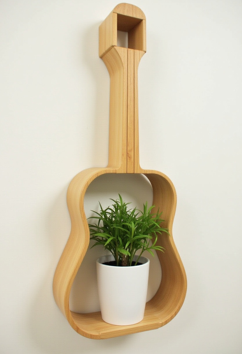 A creative wall-mounted planter shaped like a guitar holds a green plant in a white pot, adding charm to interior spaces.
