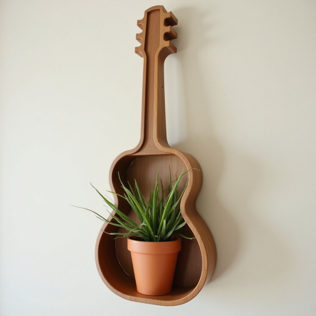 This creative shelf is designed like a guitar and holds a small potted plant. It adds a playful touch to any room decor.