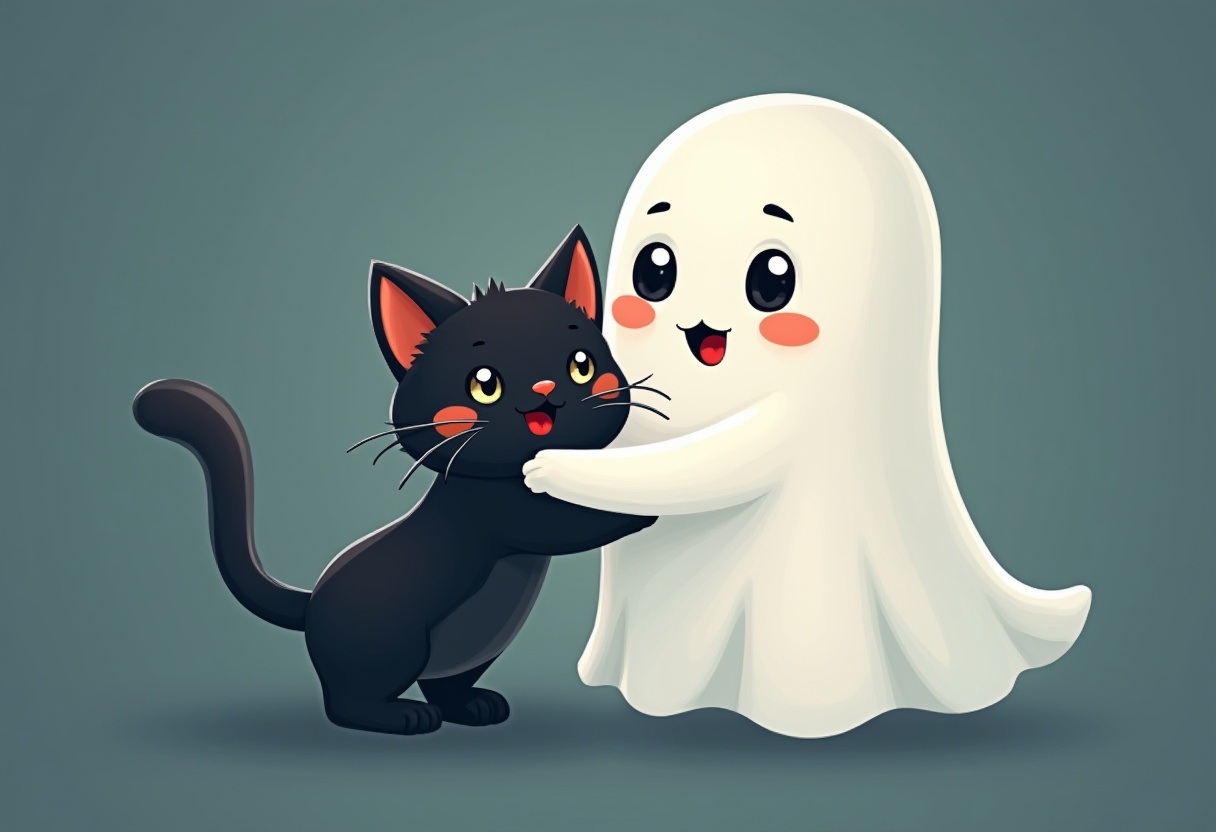 A playful black cat embraces a cheerful ghost in a friendly scene. Their joyful interaction adds a fun and whimsical vibe.