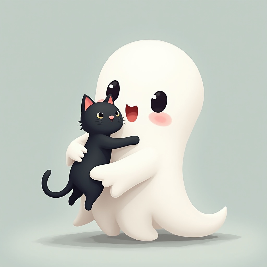 Cute ghost hugs a black cat in a playful scene