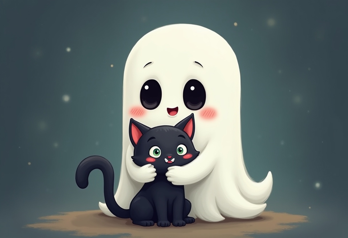 A friendly ghost embraces a black cat, both showing happy expressions in a whimsical and colorful setting.