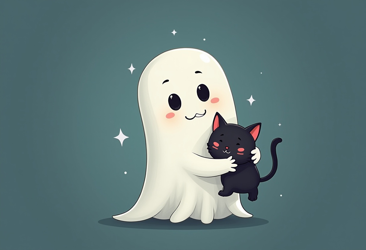 adorable, animal, black cat, cartoon, character, cheerful, creativity, cute, fantasy, friendly, fun, ghost, hugging, illustration, pet, playful, smiling, soft colors, spirit, whimsical