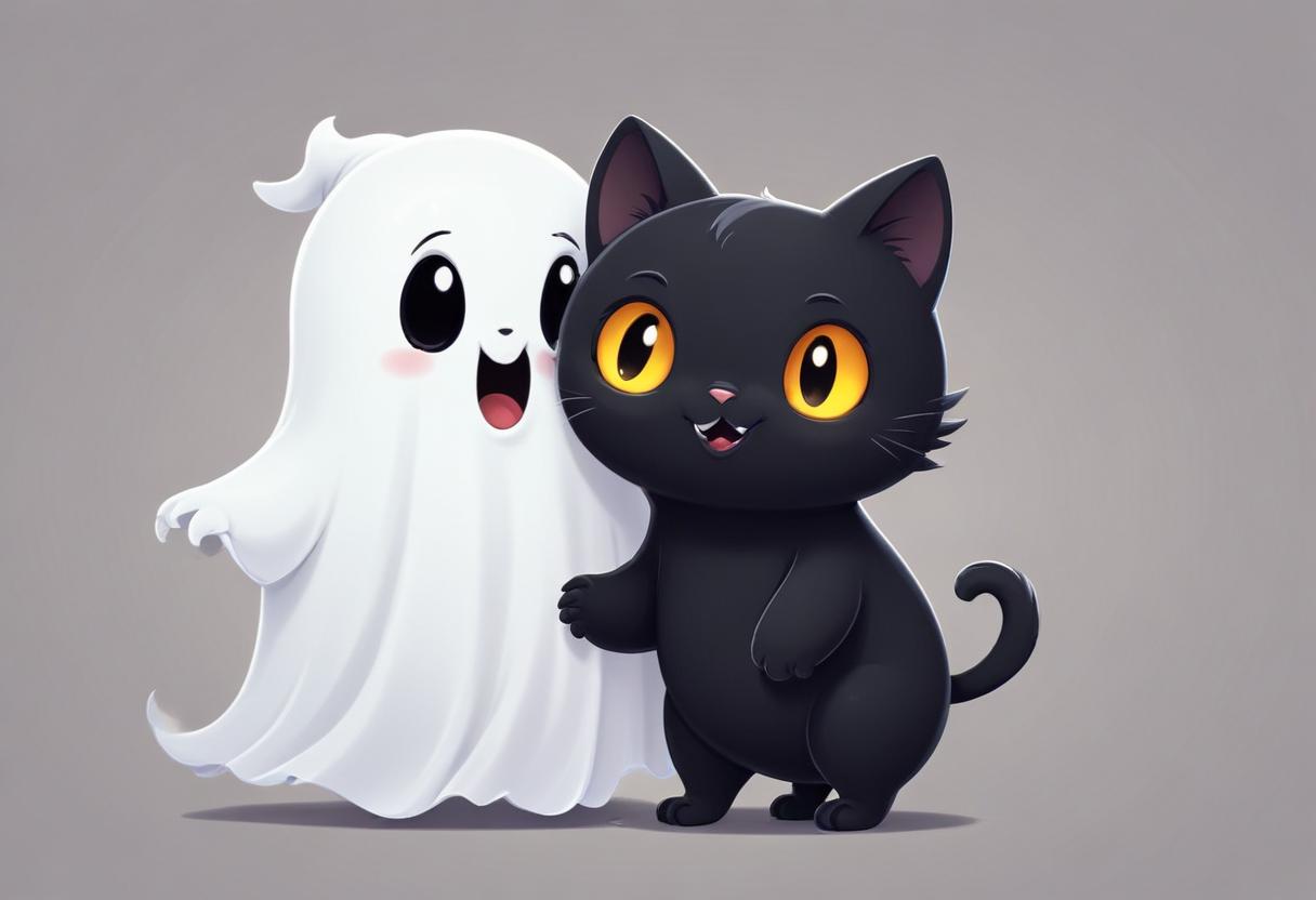 A cute black cat with bright yellow eyes and a friendly ghost share a joyful moment, showcasing their bond in a playful scene.