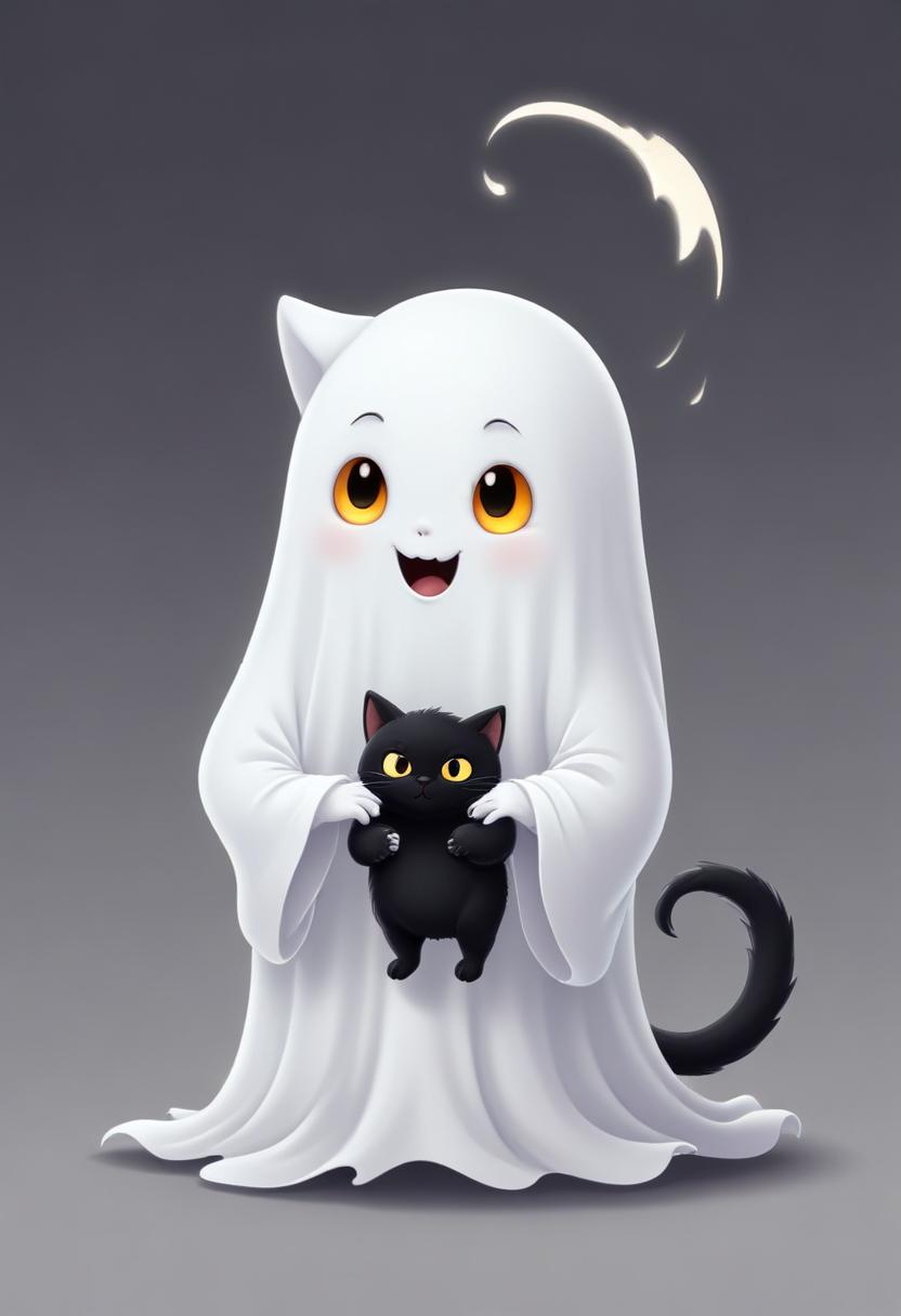 A cute ghost character with big eyes holds a black cat. Both look cheerful, ideal for a light-hearted Halloween theme.