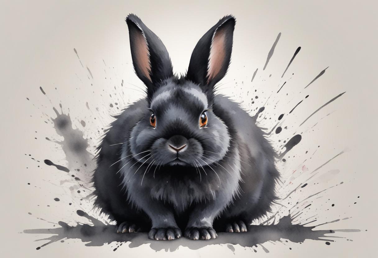 A fluffy black rabbit sits confidently with expressive eyes, surrounded by artistic splashes of gray, showcasing its charming features.