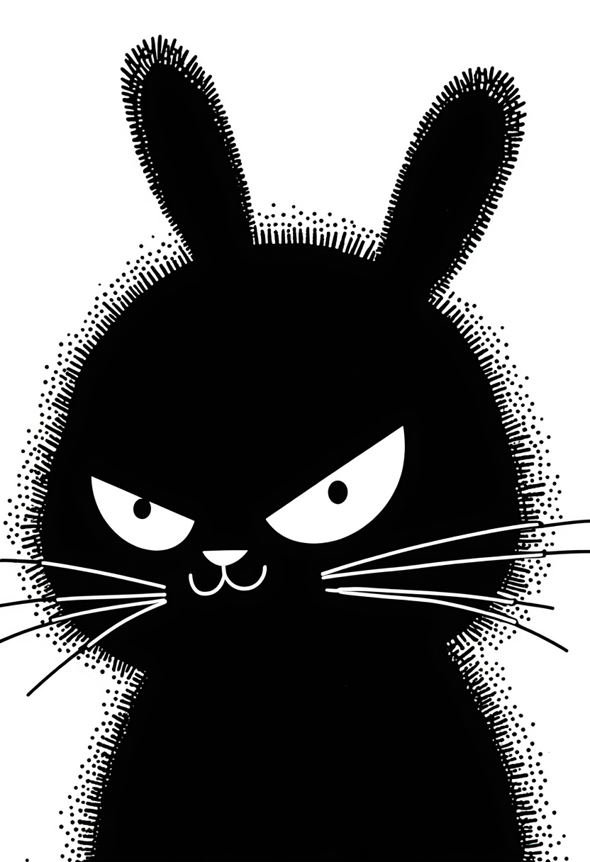 A stylized black rabbit shows an intense look with narrowed eyes and distinct whiskers against a white background.