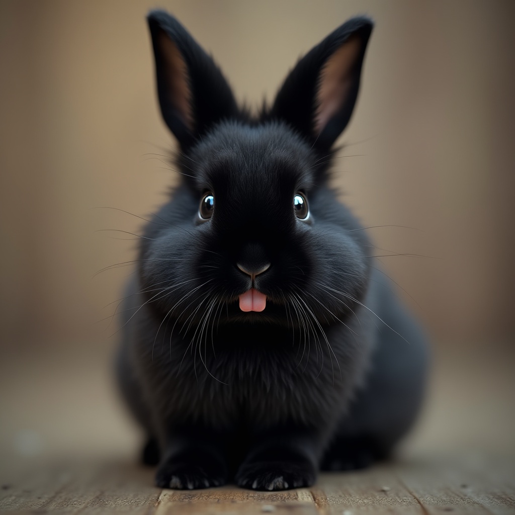 A black rabbit sits on a wooden surface, looking curious with its ears perked up and a playful expression, showcasing its fluffy fur.