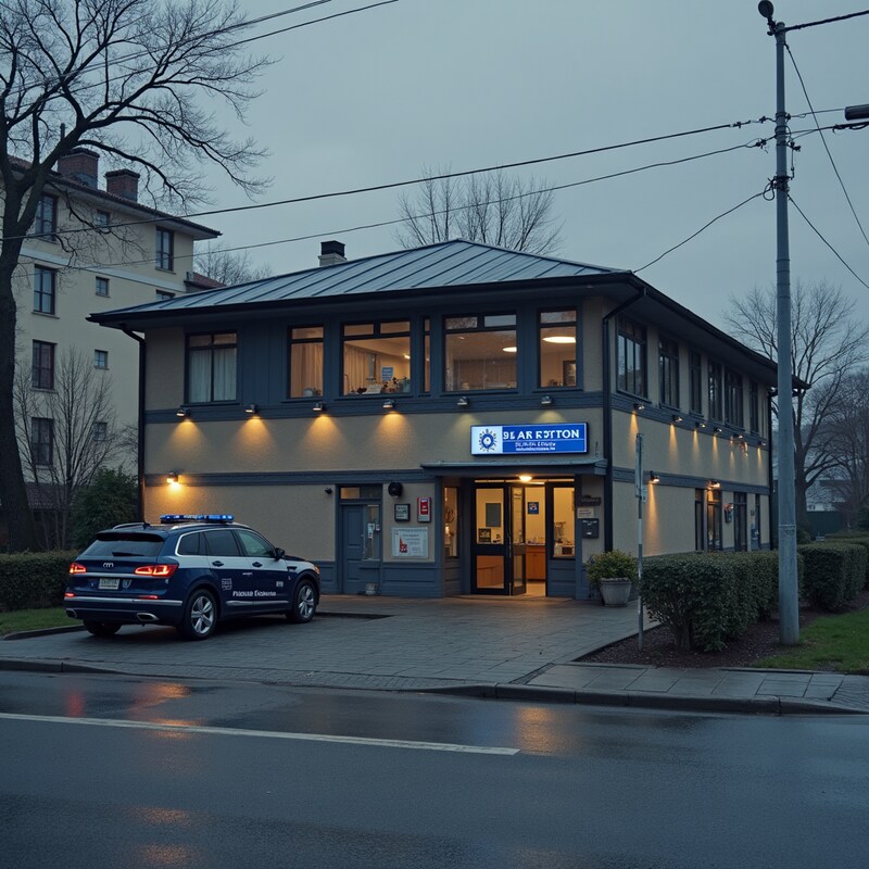 Police station during dusk in a quiet neighborhood
