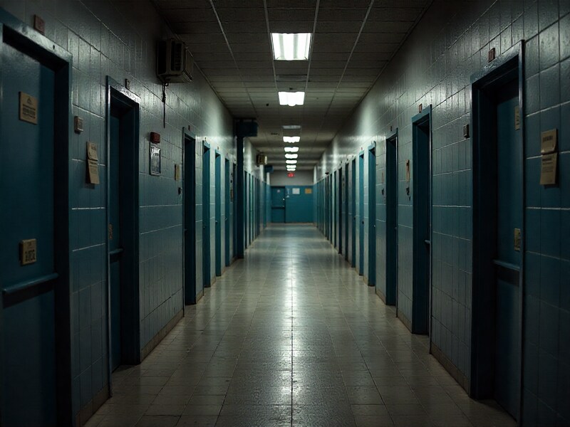 A long hallway features blue doors on either side, illuminated by overhead lights in a calm and quiet setting, suggesting early morning.