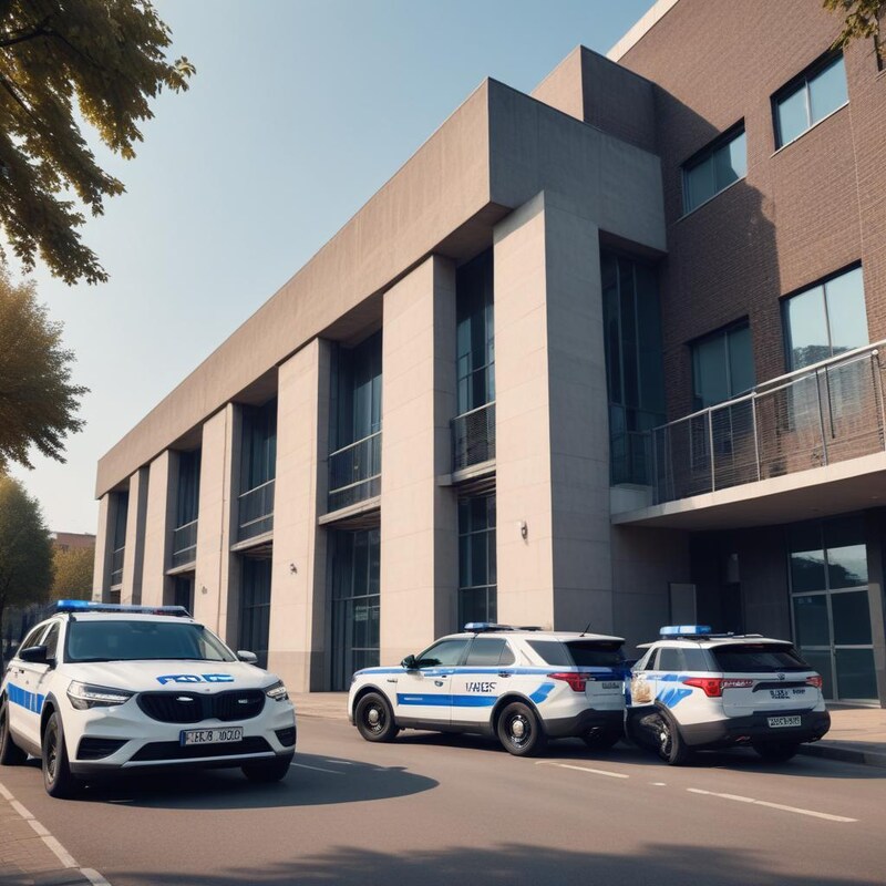 architecture, civic duty, community, crime prevention, daytime, emergency, law enforcement, modern building, officers, parking, patrol, police, public safety, response, security, street, surveillance, transportation, urban, vehicles