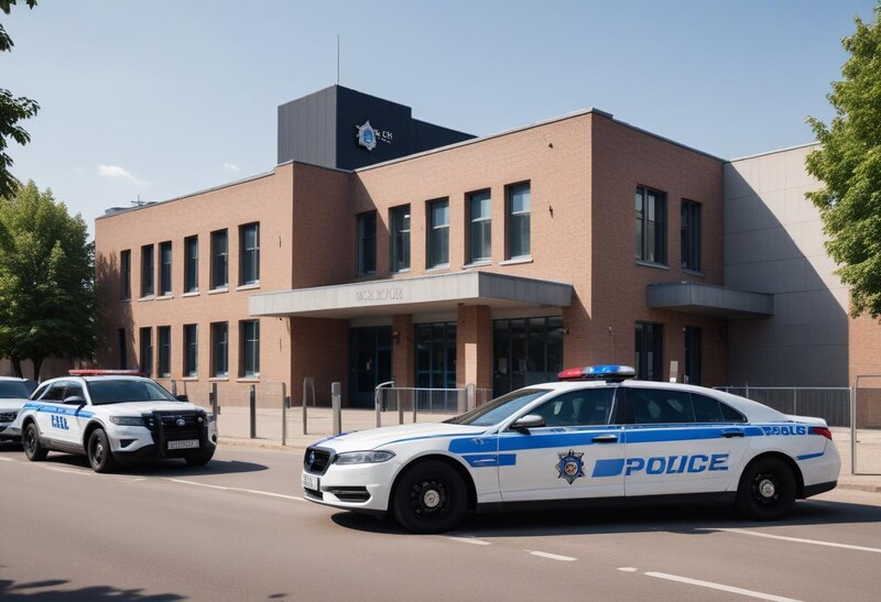 Police station exterior shows two vehicles parked outside on a sunny day. The building is modern with clear signage.