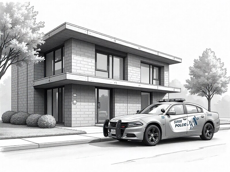 architectural style, architecture, bushes, community, daytime, law enforcement, modern building, neighborhood, parked vehicle, police car, police presence, public safety, quiet street, security, service vehicle, sidewalk, suburban area, trees, urban design, vehicle design