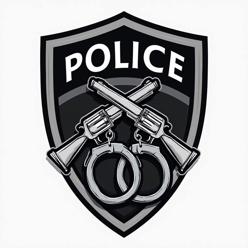 A police badge features crossed rifles and handcuffs against a dark background, representing authority and law enforcement.