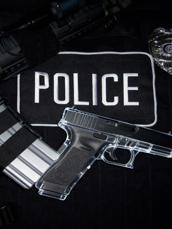 A clear plastic handgun rests on a police uniform with a badge. Nearby, additional equipment is visible, highlighting law enforcement tools.