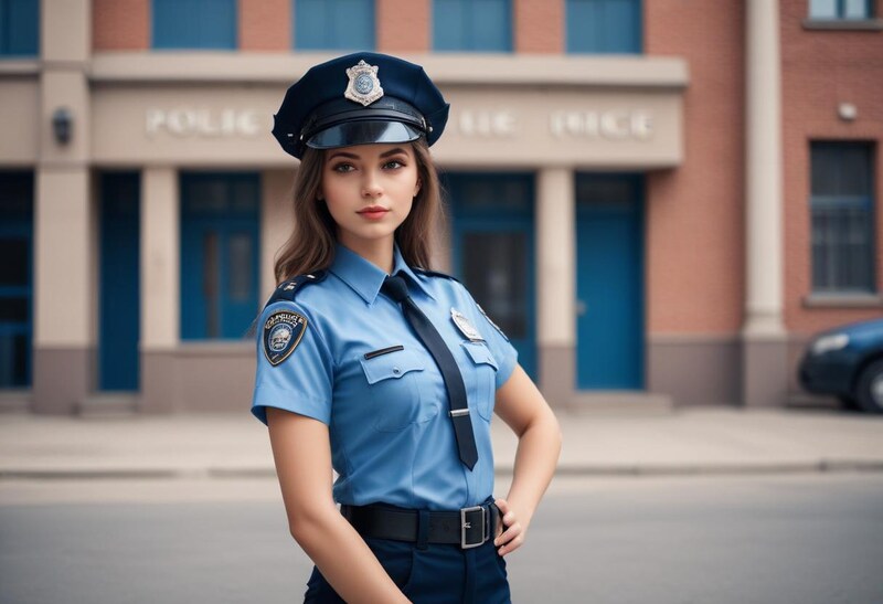 A young police officer poses outside a police precinct in uniform, showcasing her role in community safety and law enforcement.
