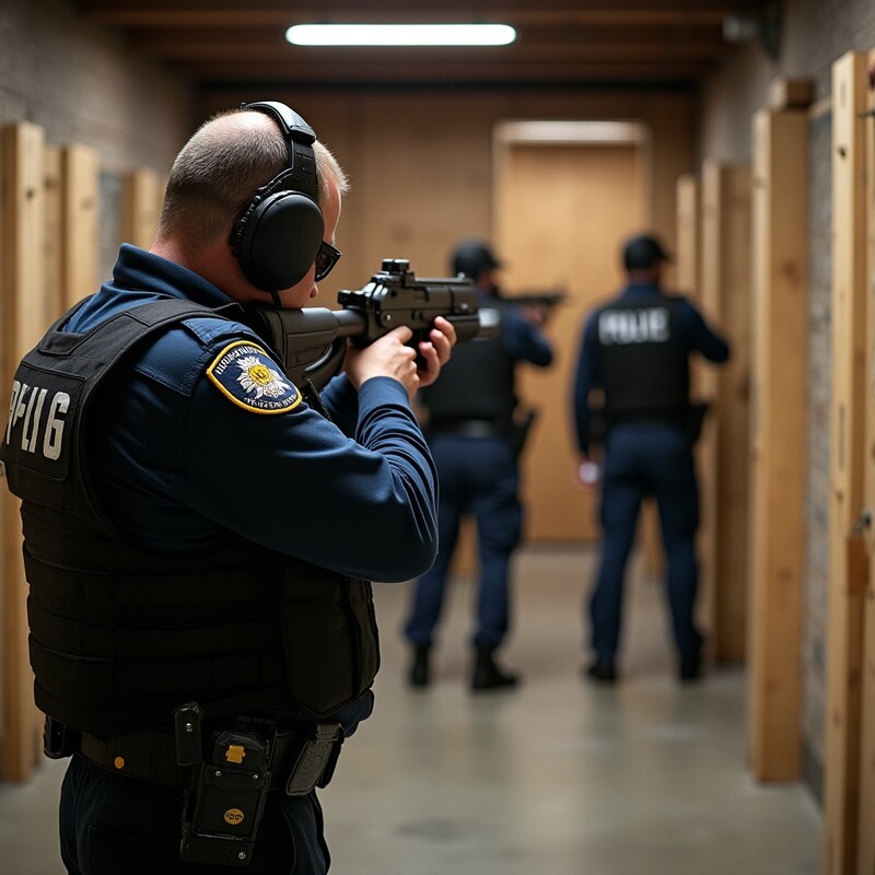 Officers practice shooting techniques at a training range, focusing on precision and teamwork during evening drills.