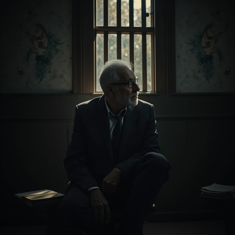An elderly man in formal attire sits quietly by a window in a dark room, contemplating life while shadows play around him.