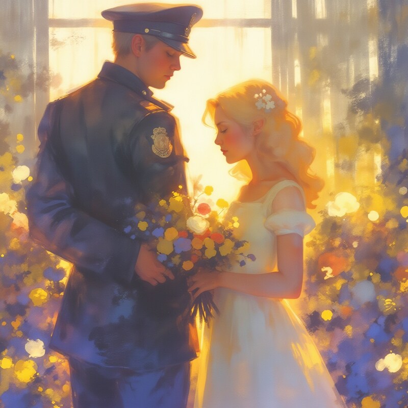 A police officer and a woman share a tender moment surrounded by vibrant flowers during sunset, capturing love and connection.