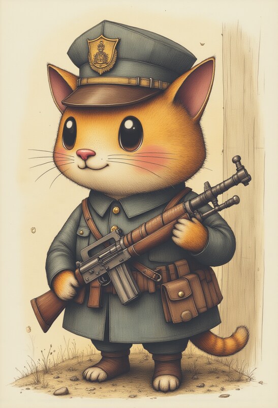 A charming cat in a military uniform stands proudly, holding a rifle.