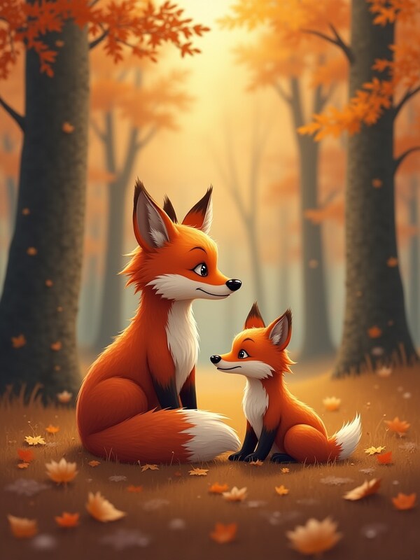 animal, autumn, baby, cute, forest, fox, leaves, mother, nature, orange, outdoor, peaceful, season, serene, sitting, sunlight, together, trees, wildlife, woods