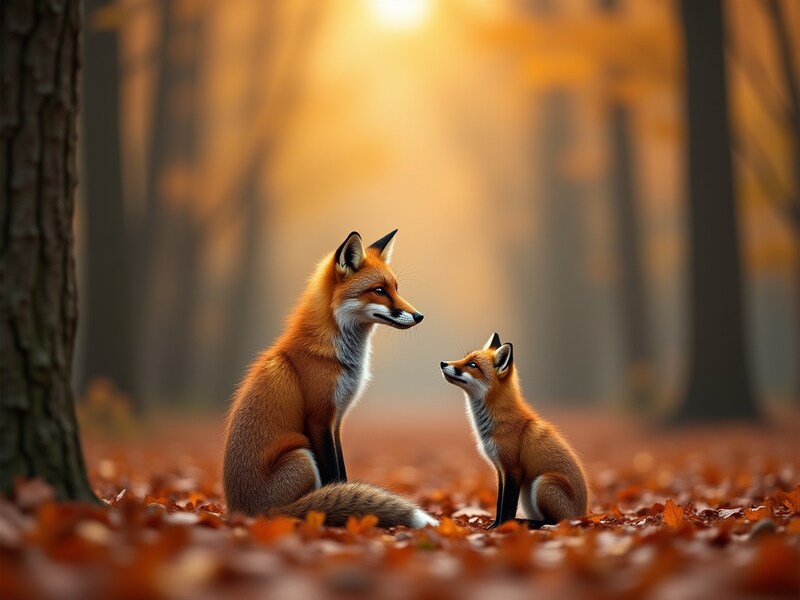 Fox and cub in a serene autumn forest setting