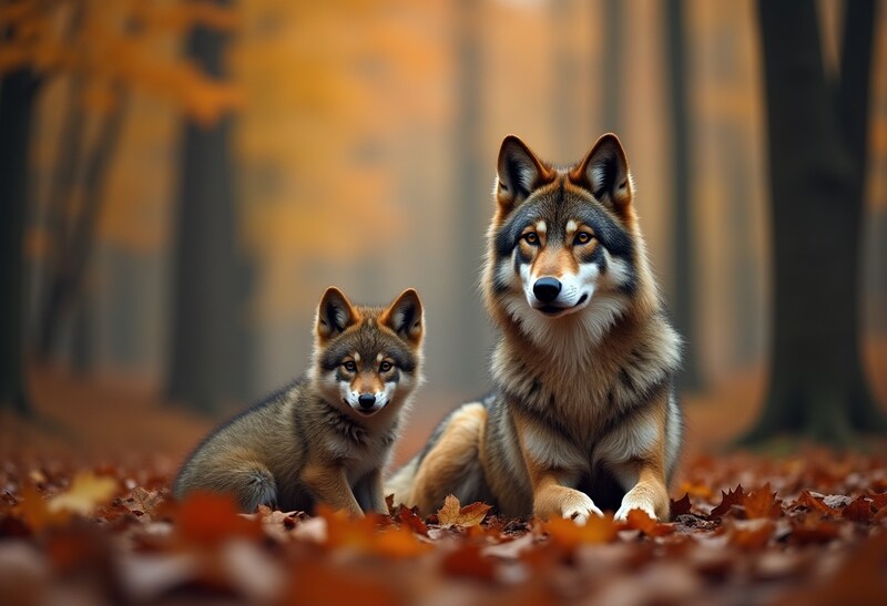 animals, autumn, canine, fall colors, forest, forest floor, grey wolf, leaves, mother wolf, natural habitat, nature, outdoor, peaceful scene, pup, serene, tranquility, wilderness, wildlife, wildlife bond, wolves