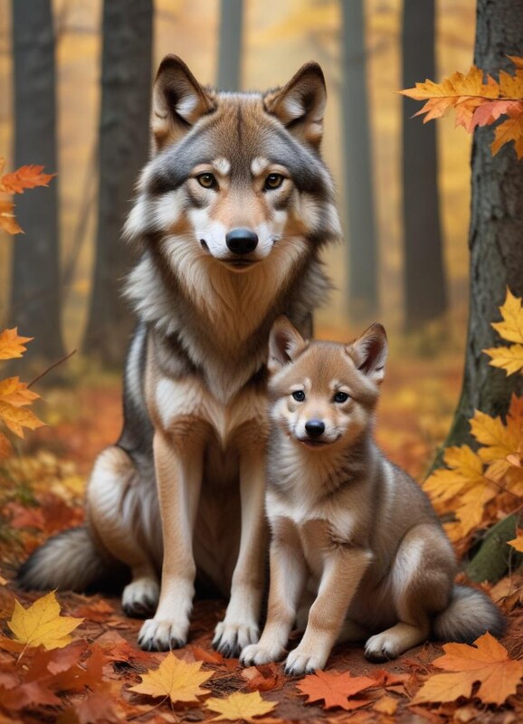 adult wolf, animal behavior, animals, autumn, brown fur, companionship, environment, family, forest, leaves, nature, outdoors, park, peaceful, scenery, tranquility, trees, wildlife, wolves, young wolf