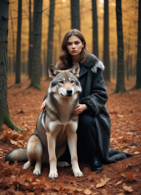 In a serene forest during autumn, a woman kneels beside a wolf. They are surrounded by orange and brown leaves, creating a calm atmosphere.