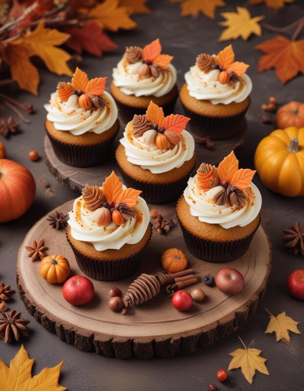 autumn, baking, brown, celebration, cupcakes, decorations, dessert, fall, festive, flavors, food, frosting, harvest, leaves, orange, pumpkins, seasonal, spices, sweet treats, wooden board