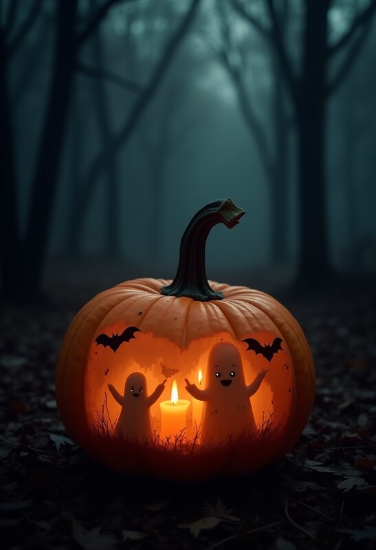 Spooky pumpkin with glowing ghosts in dark forest scene