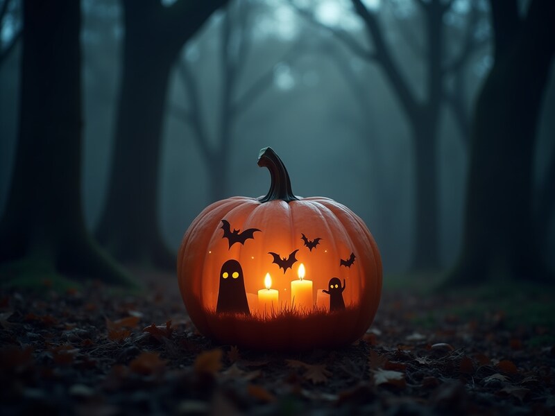 A carved pumpkin glows with candles inside, surrounded by foggy trees. Bats and ghost silhouettes add to the Halloween atmosphere.