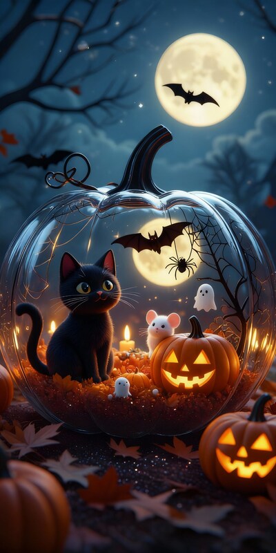 A black cat sits inside a carved pumpkin, surrounded by playful mice and glowing candles. Bats fly under a full moon at night.