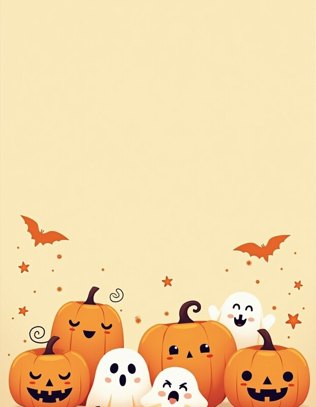 Colorful pumpkins with cheerful faces and playful ghosts create a festive Halloween atmosphere.