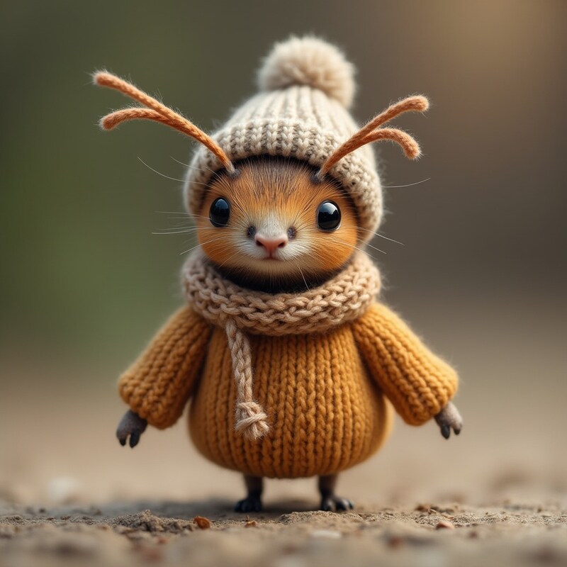 A small squirrel wears a cozy sweater and hat while standing on a path. The scene evokes a cheerful, autumn atmosphere with soft lighting.