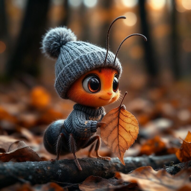 A small ant dressed in a cozy sweater and hat holds a leaf in a colorful autumn forest. The scene is warm and enchanting.