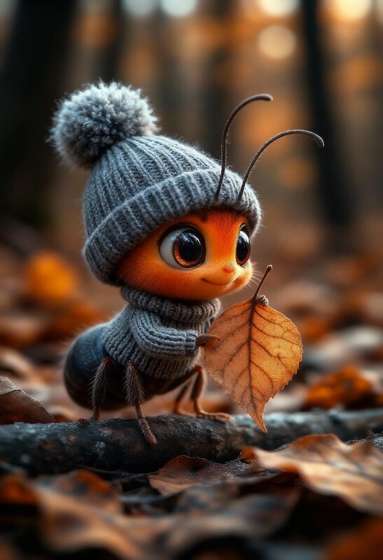 A small cartoon ant dressed in a knitted sweater and hat picks up a yellow leaf in a forest during autumn.