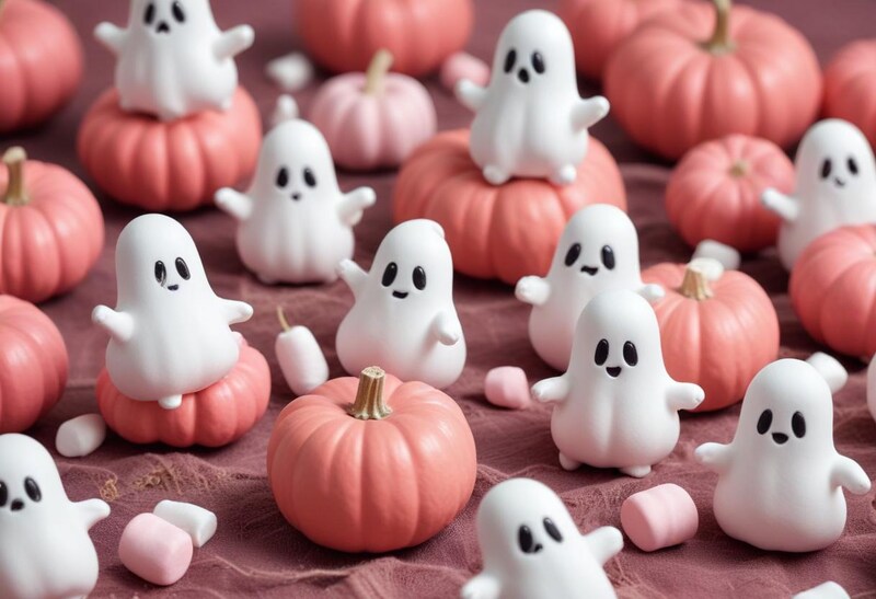 Halloween, autumn, celebration, characters, cute, decorations, festive, figures, fun, gathering, ghosts, marshmallows, party, pink, playful, pumpkins, seasonal, small, toys, treat