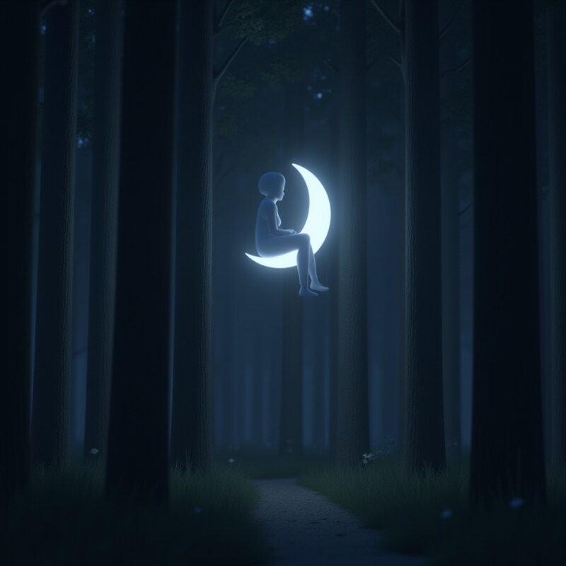 A child sits on a luminous crescent moon, surrounded by tall trees in a dark forest at night. The scene feels magical and serene.