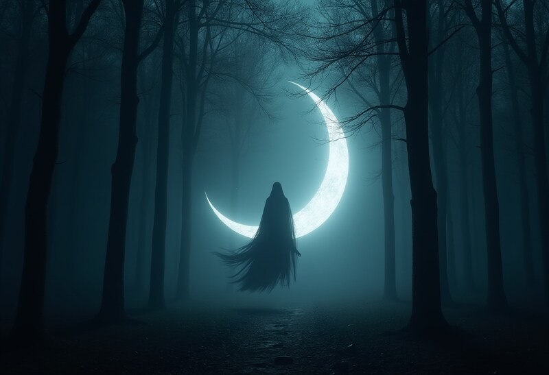 A mysterious figure stands in a dark forest, illuminated by a large crescent moon surrounded by fog and trees, creating an eerie atmosphere.