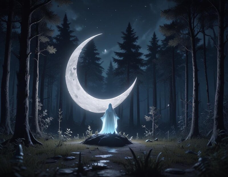A figure in a flowing garment stands on a rock, gazing at a large glowing moon in a dark forest.