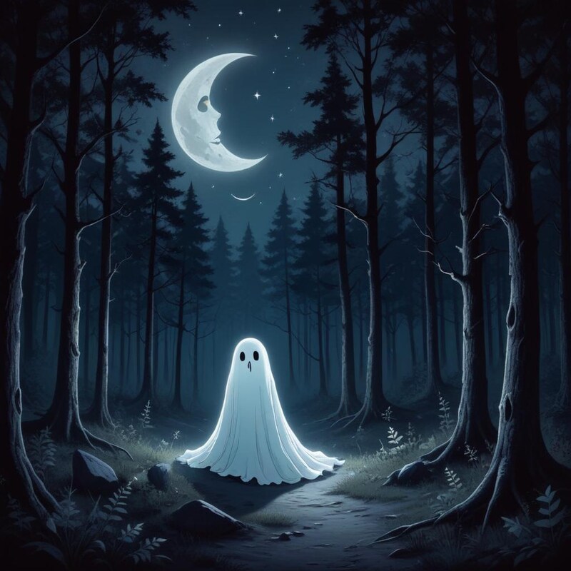 A spooky ghost stands in a dark forest beneath a crescent moon, surrounded by tall trees and soft, glowing light illuminating its form.
