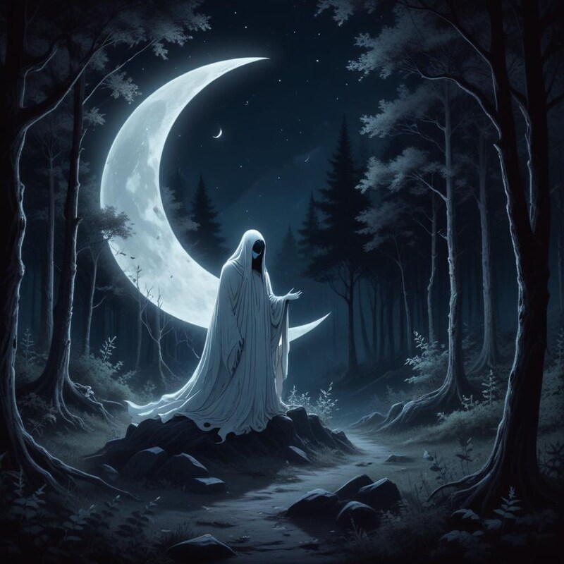 A ghostly figure stands beside a large crescent moon in a dark forest. The scene evokes mystery and magic among the trees.