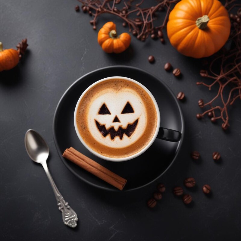 Halloween, autumn, beverage, black cup, cinnamon stick, coffee, coffee beans, cozy, decoration, drink, fall flavors, festive, gathering, home cafe, latte art, pumpkin spice, seasonal, small pumpkins, spooky, warm drink