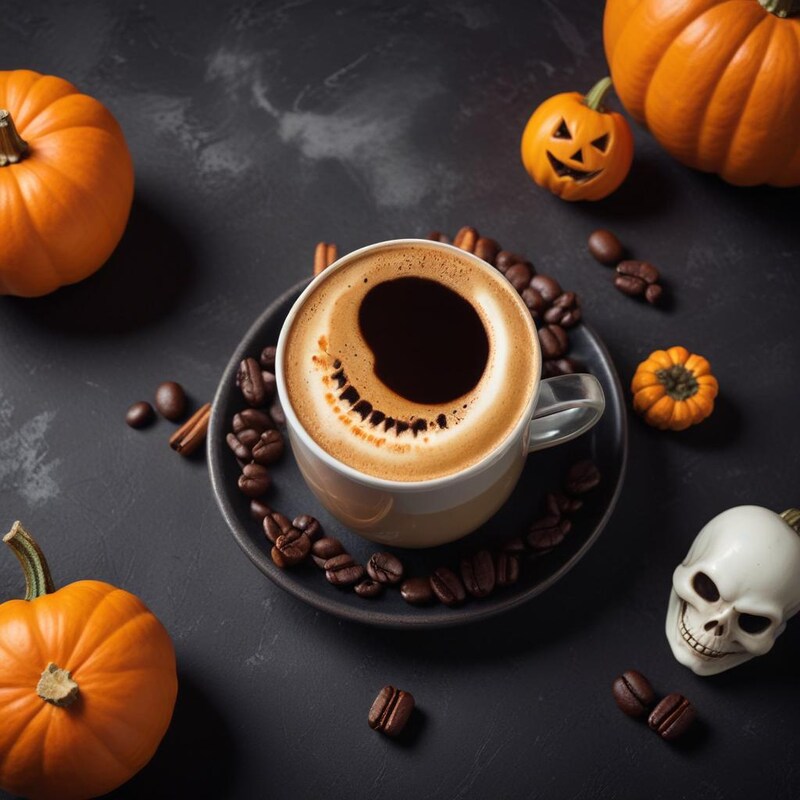 Halloween, autumn, beverage, coffee, coffee beans, cozy, decorations, enjoy, fall, festive, morning, mug, orange, pumpkins, relax, seasonal, skull, spooky, tabletop, warm drink