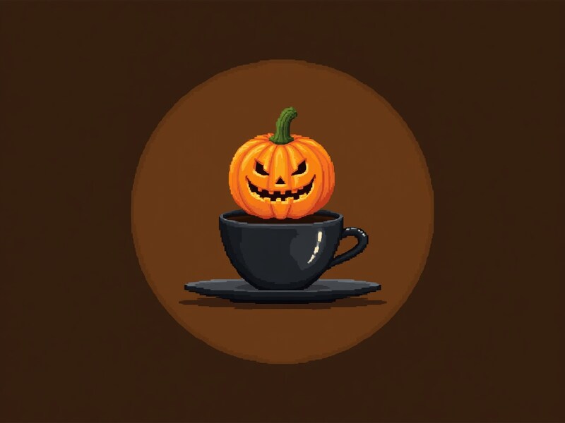 A spooky pumpkin sits atop a black coffee cup on a dark brown background, capturing the festive spirit of Halloween.